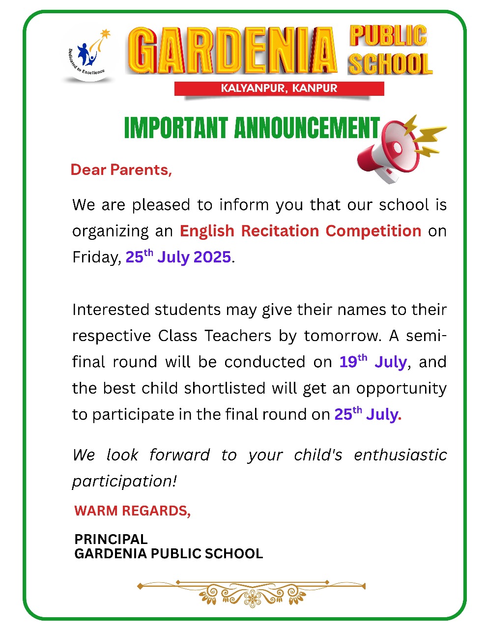 2025English Recitation Competition - Class I & IIEnglish Recitation Competition for Class 1&2 will be held on Friday, 25th July.