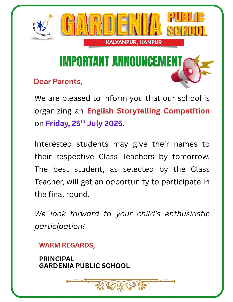 2025English Storytelling Competition - Classes III - VEnglish Storytelling Competition for Classes 3 to 5 will be held on Friday, 25th July.