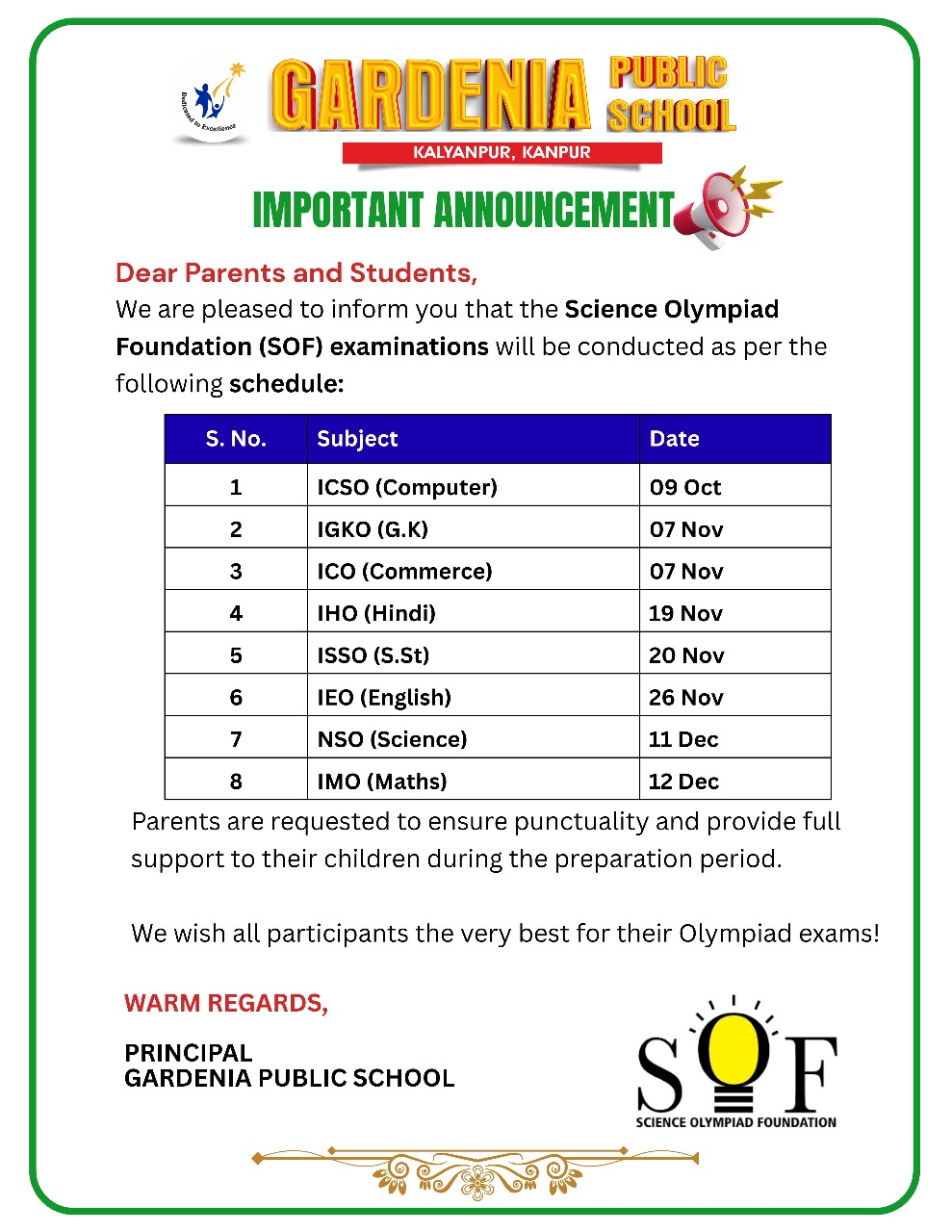 2025Science Olympiad Foundation SOF ExamsDear Students, Please find the attached circular for SOF Exam Schedule.